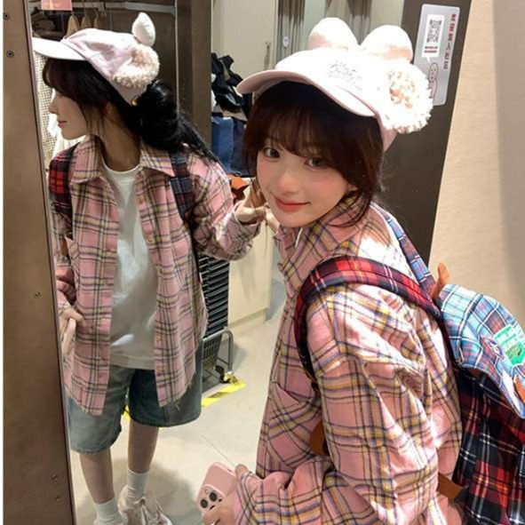 ゆったりシルエットが魅力のピンクチェックシャツ