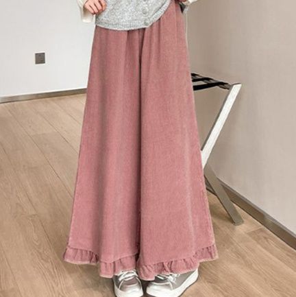 表情豊かなコーデュロイ素材の裾フリルワイドパンツ。