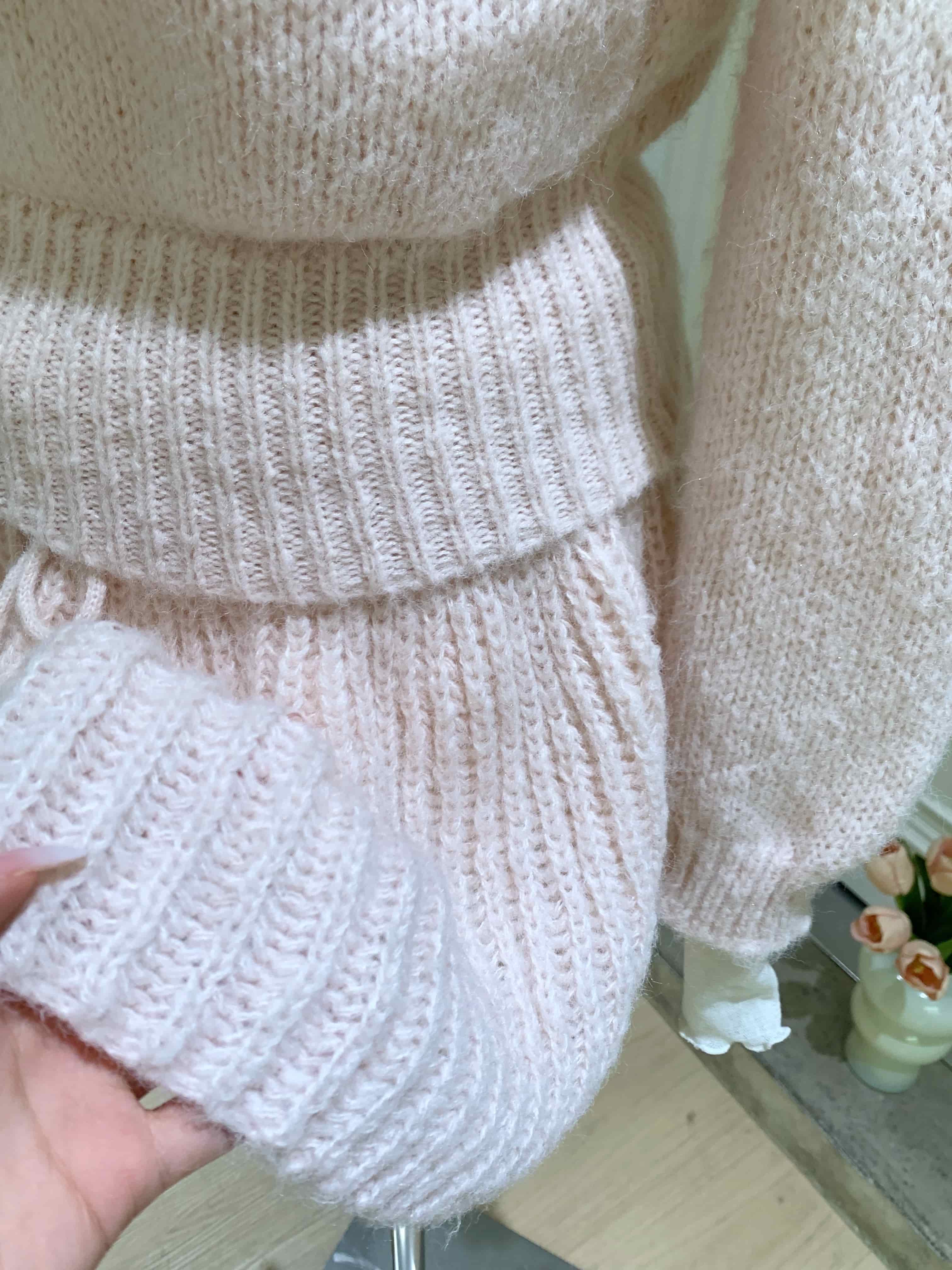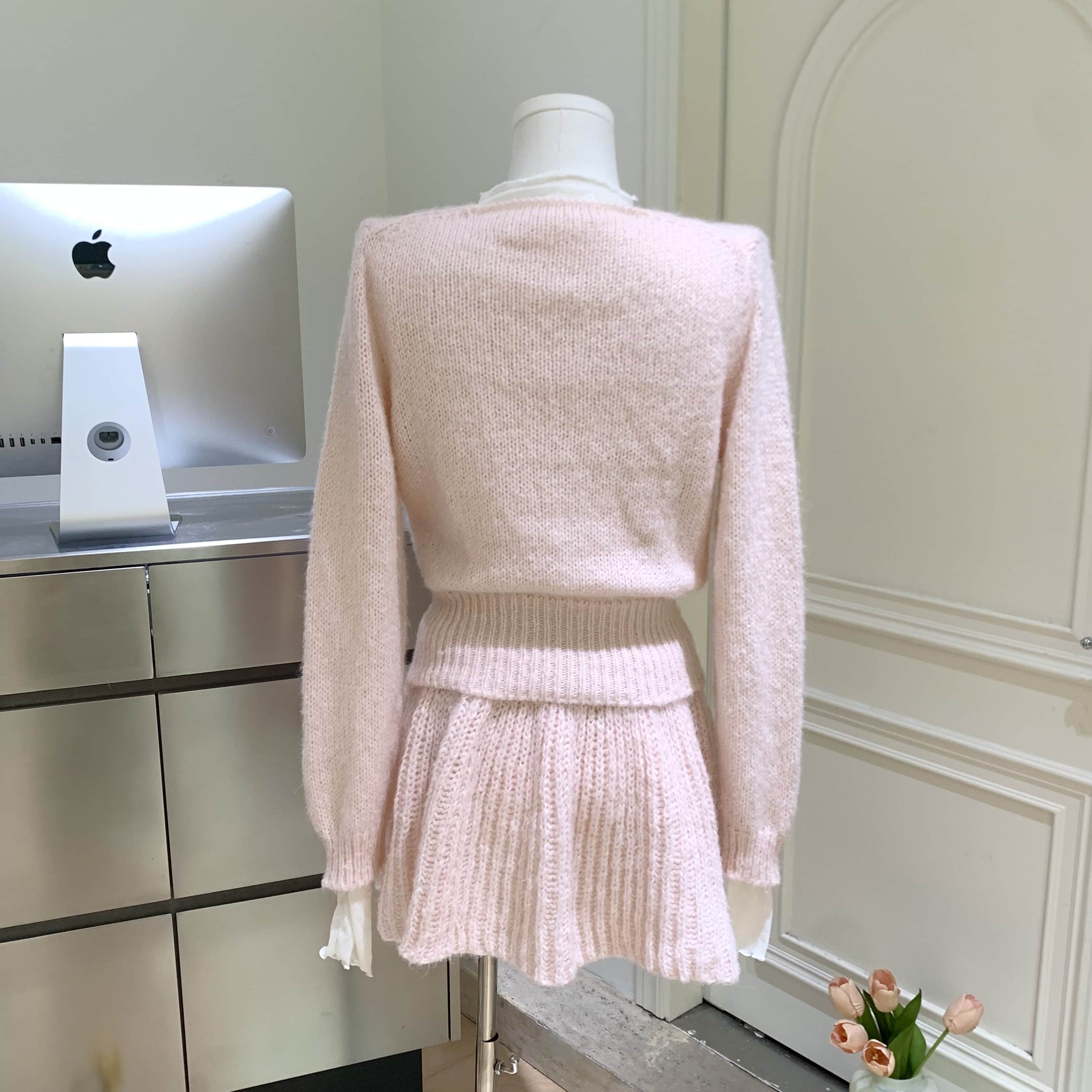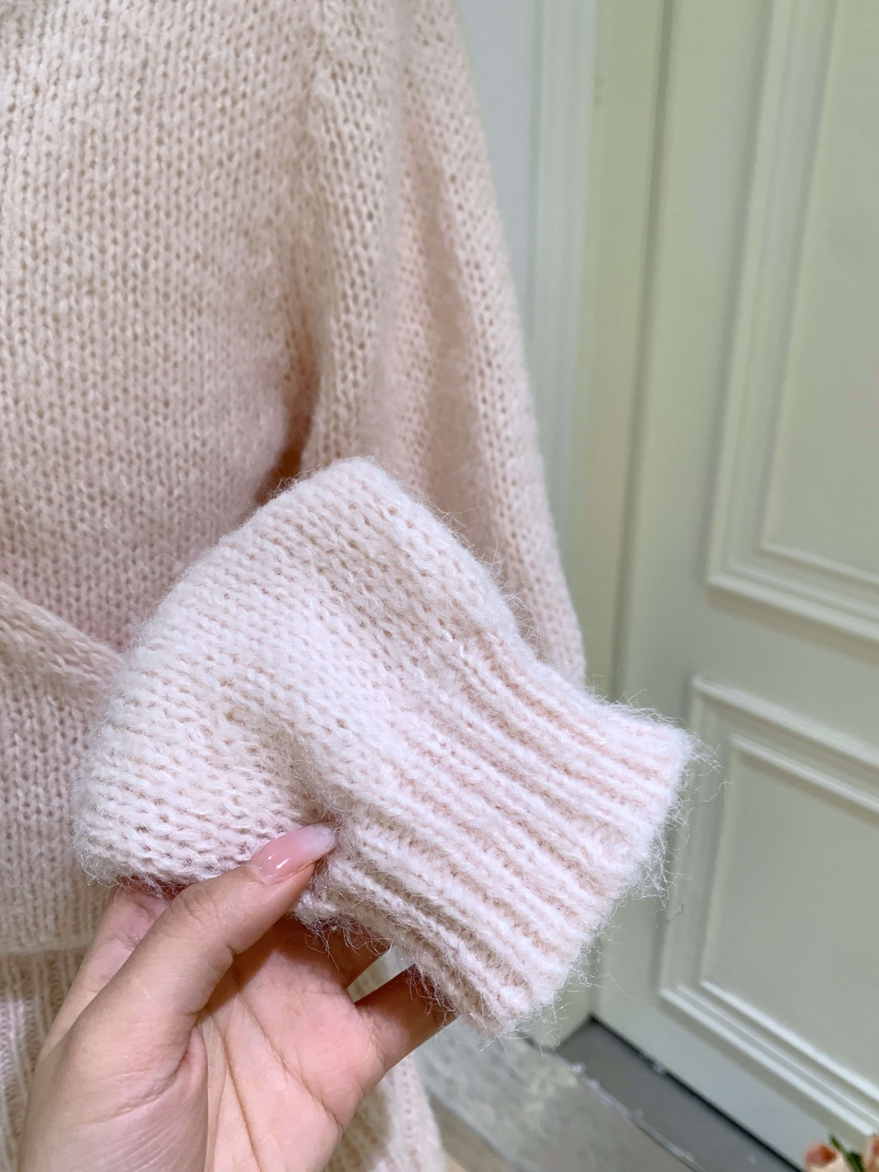 【サイズ】 S: バスト90cm、スカート丈32cm、袖丈58cm、裾幅70cm、着丈51cm M: バスト94cm、スカート丈33cm、袖丈59cm、裾幅74cm、着丈52cm 【カラー】ライトピンク 【素材】アクリル、ポリエステル