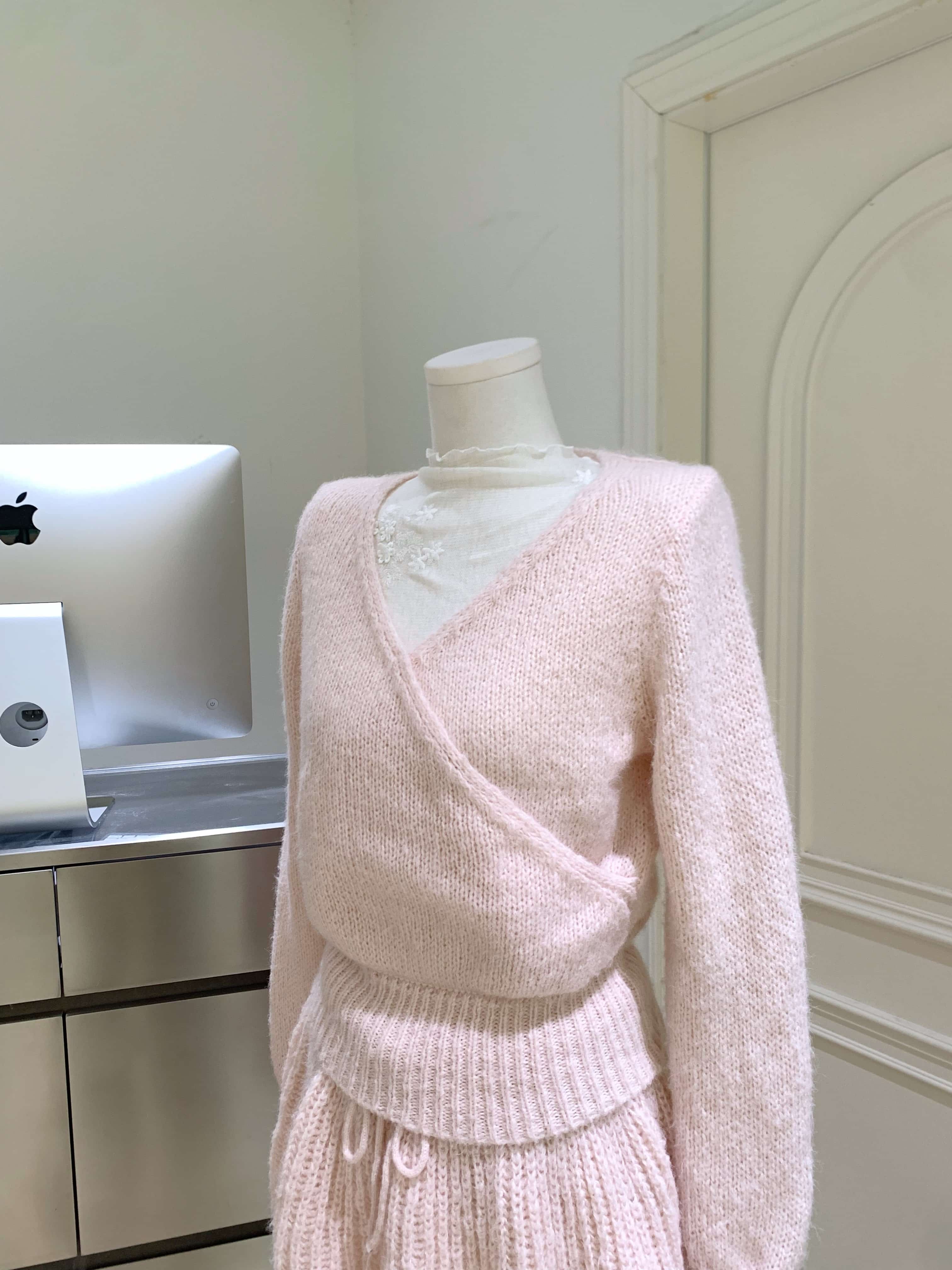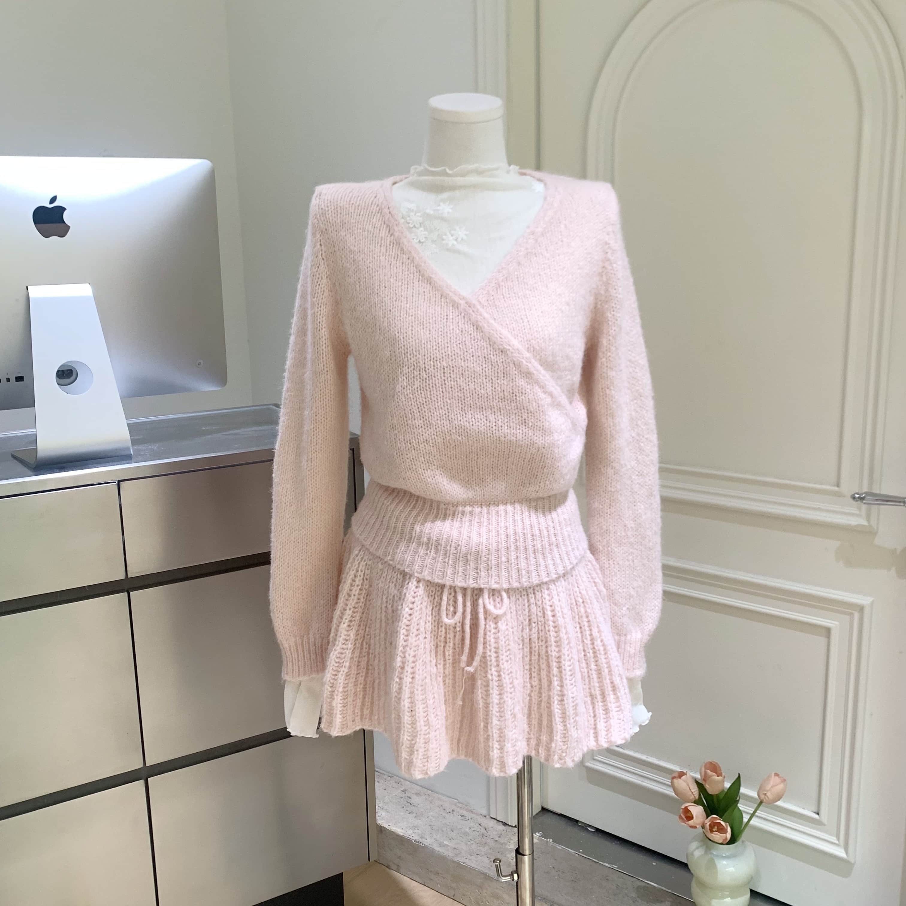上品な淡いピンクのニットトップスとレーススカートの組み合わせで、ピンクコーデの完成度を高めます。