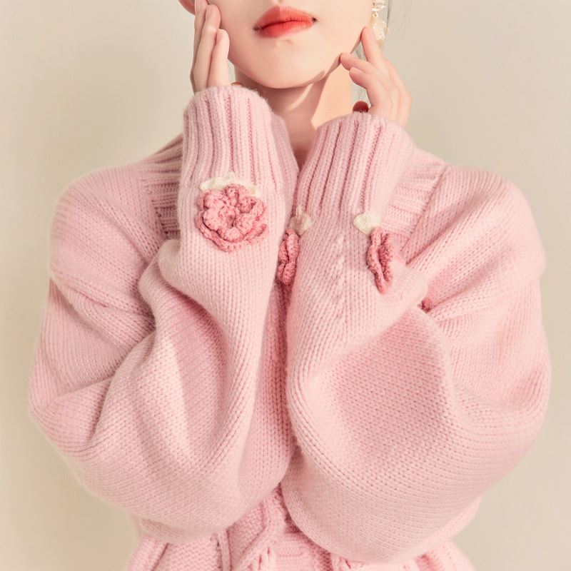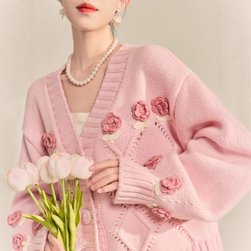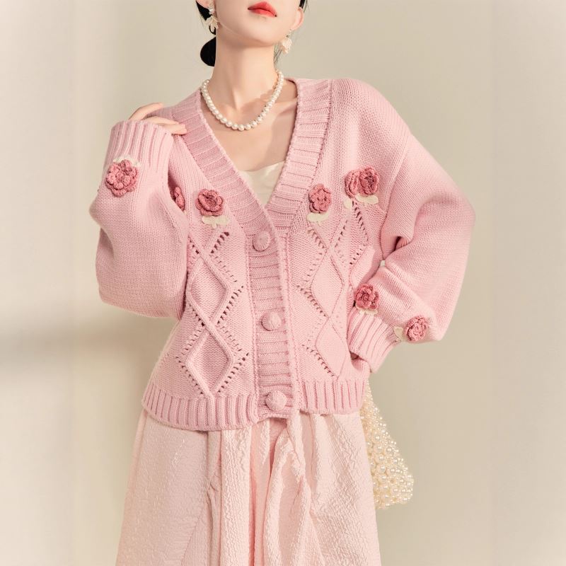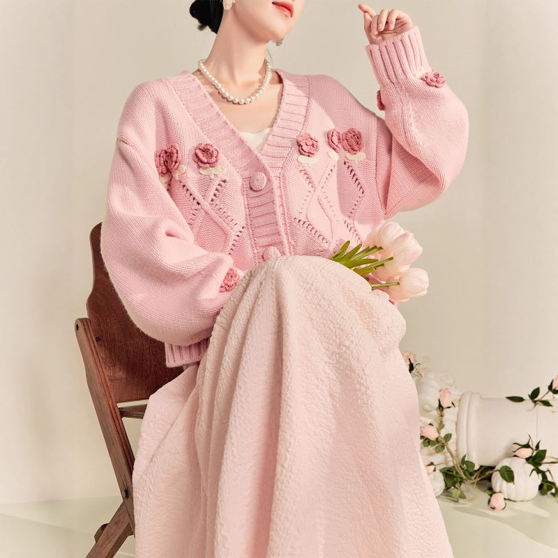 可愛い花の刺繍が散りばめられた上品なピンクカーディガンです。