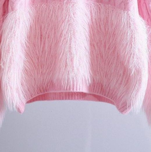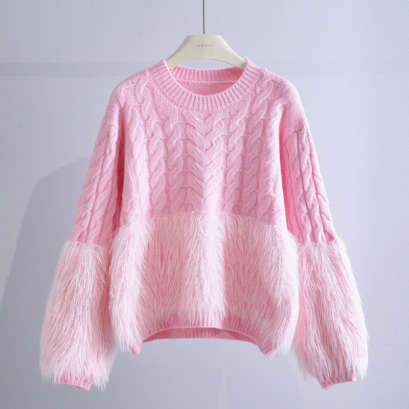身頃は繊細なケーブル模様で女性らしさを演出し、袖口のボリュームファーがアクセントになっています。