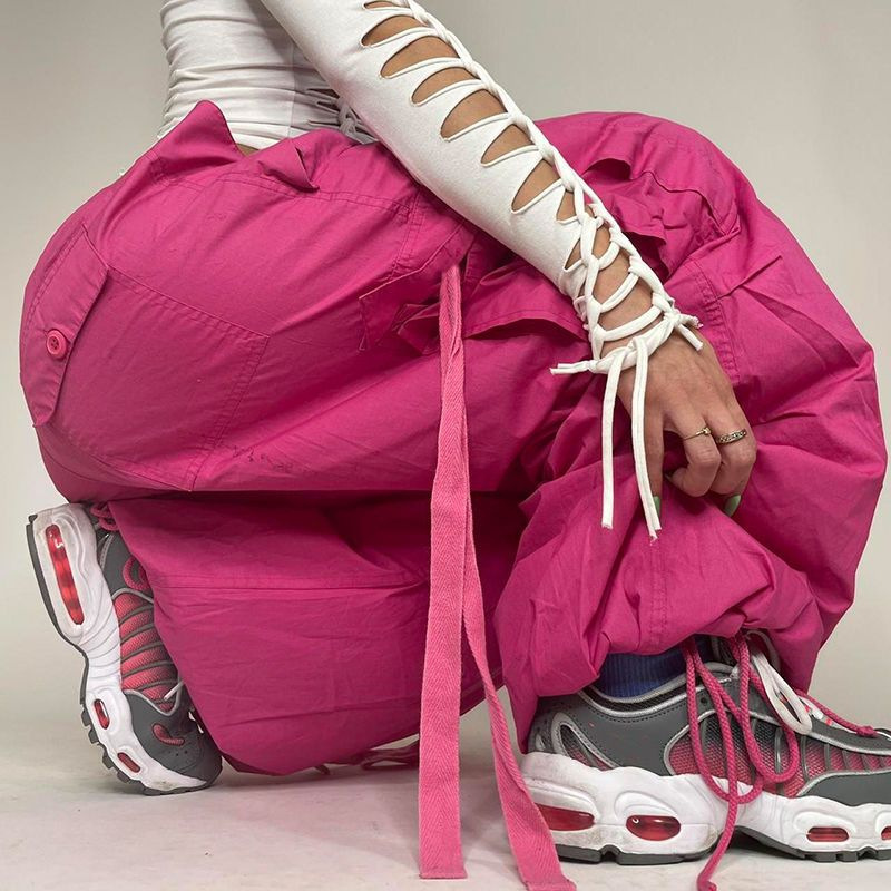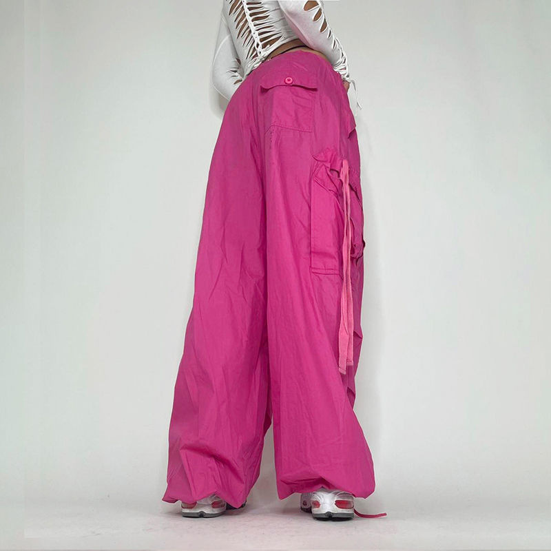 両サイドに配置された大きめポケットとリボンディテールが特徴的で、ピンクコーデに華やかさと遊び心をプラスします。