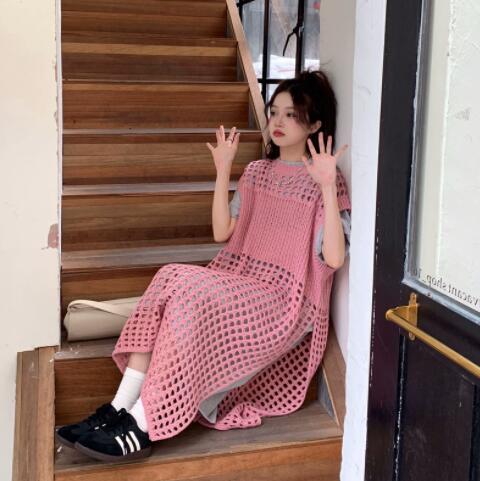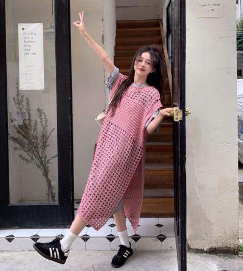 ピンクコーデの主役になる透かし編みニットワンピース。