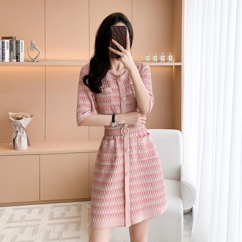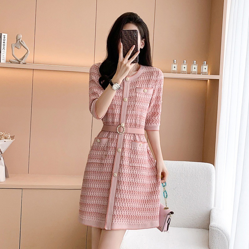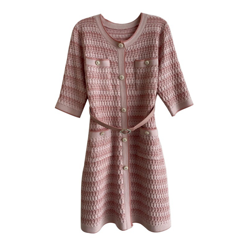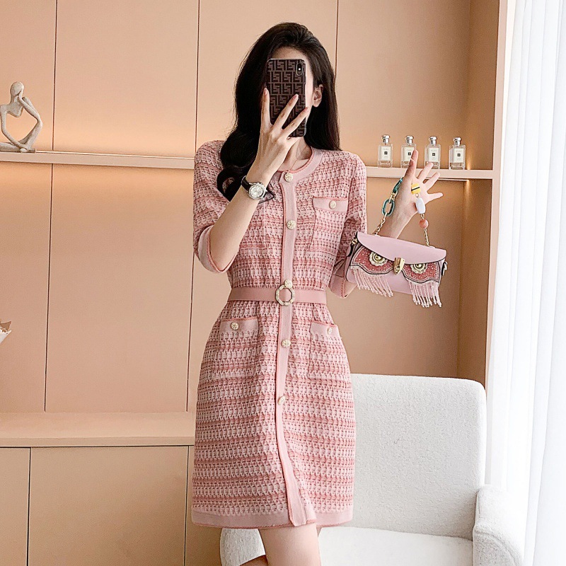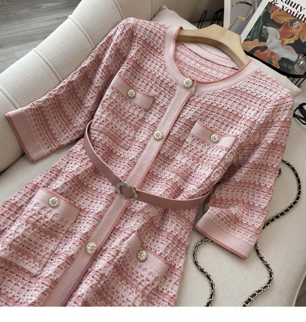 エレガントなピンクカラーのツイード風ニットワンピースです。 前開きボタンデザインとウエストベルトで、スタイルアップ効果抜群。 高級感のある質感で、ピンクコーデの主役アイテムとして活躍します。 オフィスからデートまで幅広いシーンでお使いいただけます。