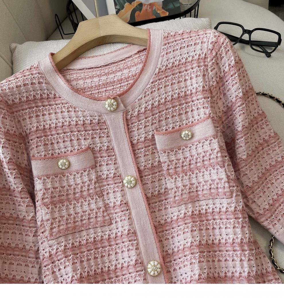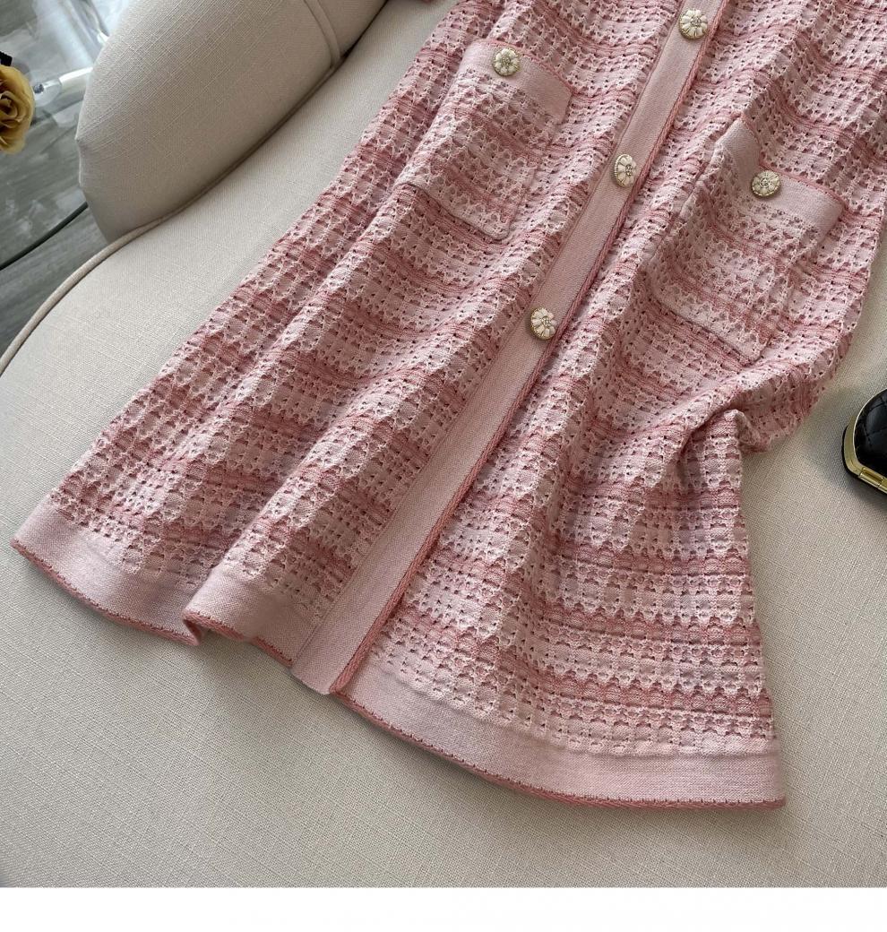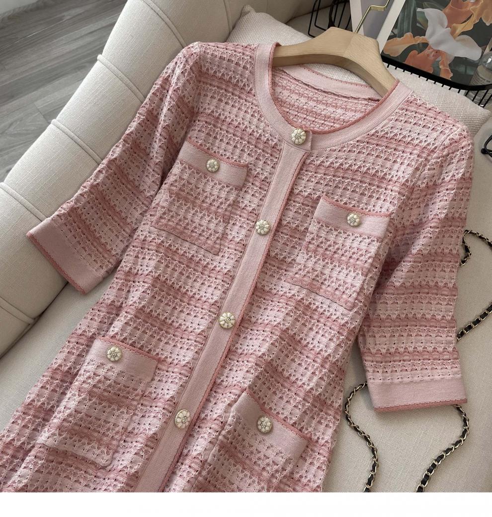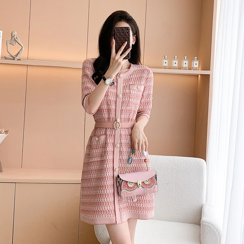 エレガントなピンクカラーのツイード風ニットワンピースです。 前開きボタンデザインとウエストベルトで、スタイルアップ効果抜群。 高級感のある質感で、ピンクコーデの主役アイテムとして活躍します。 オフィスからデートまで幅広いシーンでお使いいただけます。