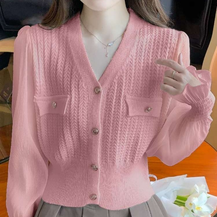 シアー素材の袖が魅力的なピンクトップス。胸元のポケットや繊細なケーブル編みが上品な印象を与えます。ボタンデザインで開閉可能、フレア袖とVネックラインがフェミニンな雰囲気を引き立てます。プリーツスカートと組み合わせることで、華やかなピンクコーデが完成。1枚でも、カーディガンとしても使えるこの万能アイテムで、あなたのスタイルに彩りを加えてみてください。