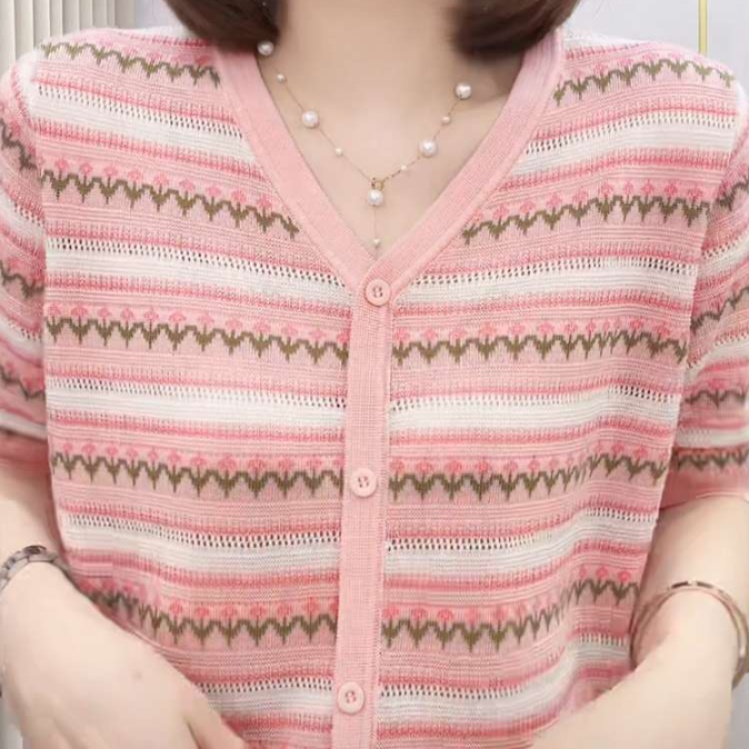 華やかなピンクが特徴の半袖カーディガンは、繊細なウェーブ模様が施されており、上品な印象を与えます。春夏にぴったりの軽やかな素材感で、ボタンダウンデザインがアクセントに。パールネックレスとのコーディネートで、よりフェミニンな雰囲気に仕上がります。黒のボトムスと組み合わせることで、ピンクコーデが一層引き立ち、様々なシーンで活躍するアイテムです。