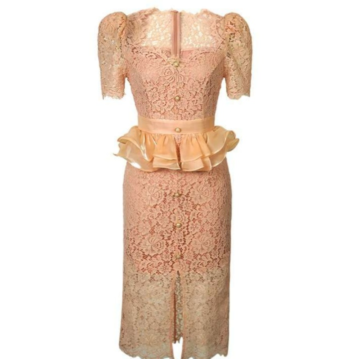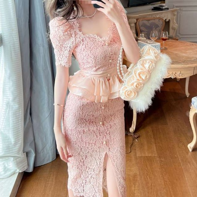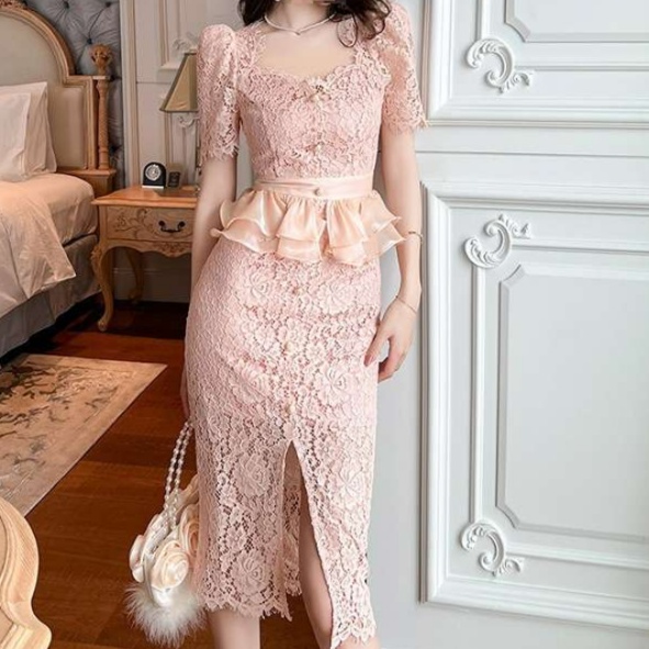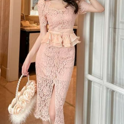 ピンクコーデにぴったりな上品なワンピース。繊細なレース素材が魅力を引き立て、胸元のスクエアネックとウエストのペプラムデザインが女性らしいシルエットを作り出します。裾のスリットが足元を華やかに見せ、特別な日やパーティーシーンでの存在感を際立たせる一着です。春夏のコーディネートにぜひ取り入れたいアイテムです。