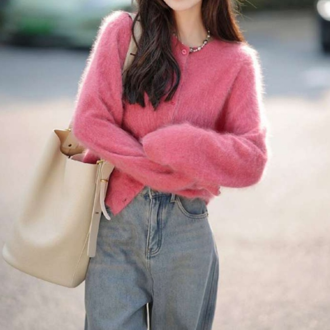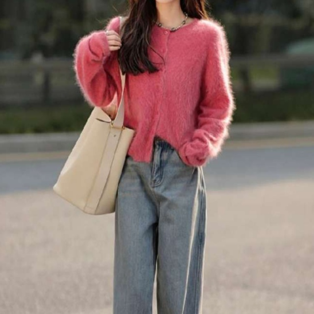 柔らかな肌触りのモヘア風素材を使用したピンクのカーディガンは、ゆったりとしたシルエットが魅力。カジュアルにもフェミニンにも着こなせ、ボタンダウンデザインで存在感抜群の一着。シンプルながらもコーディネートの主役として活躍し、ワンピースやデニムと合わせることで抜け感を演出。ピンクコーデを楽しむための必須アイテムです。あなたのスタイルに華やかさをプラスしてくれる一枚。