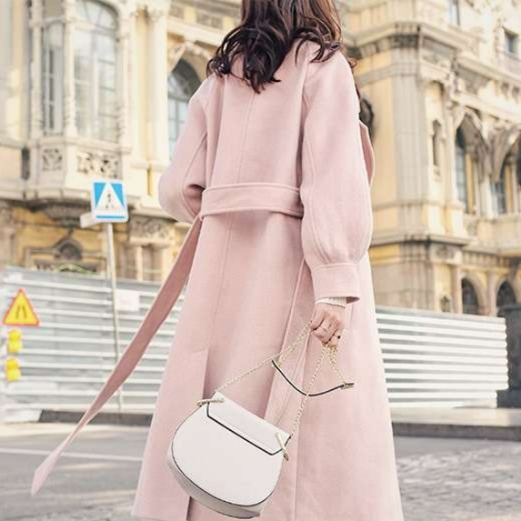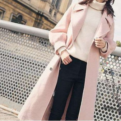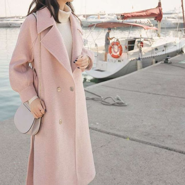 大きな襟とボリューム袖が上品な雰囲気を演出し、ピンクコーデの主役になる一着。
