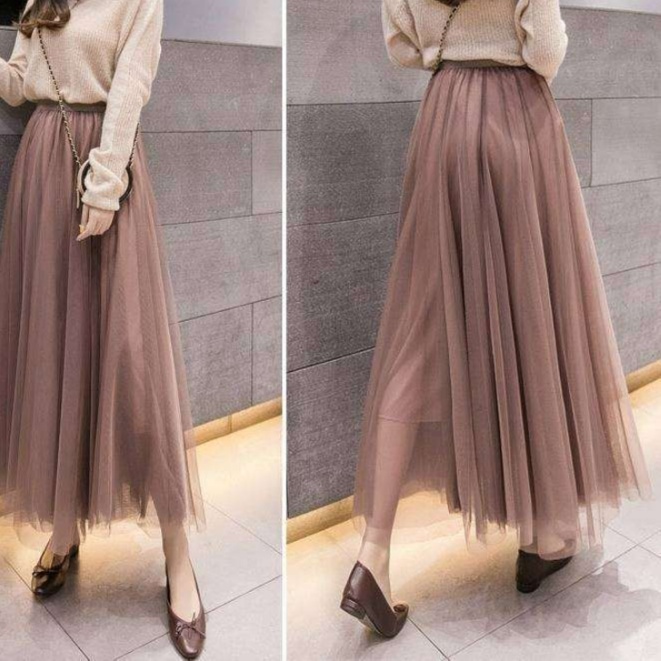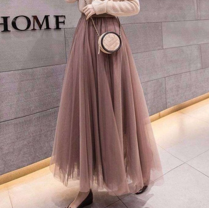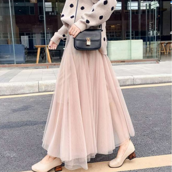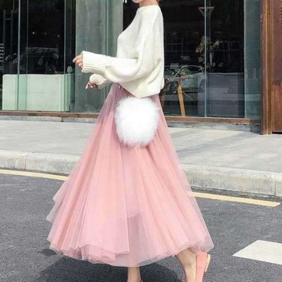 フワフワとしたチュール素材が作り出す柔らかな印象と、ウエストのギャザーが女性らしい優美な雰囲気を醸し出します。