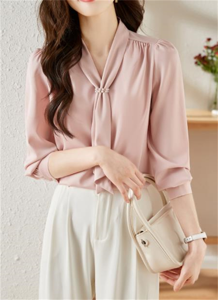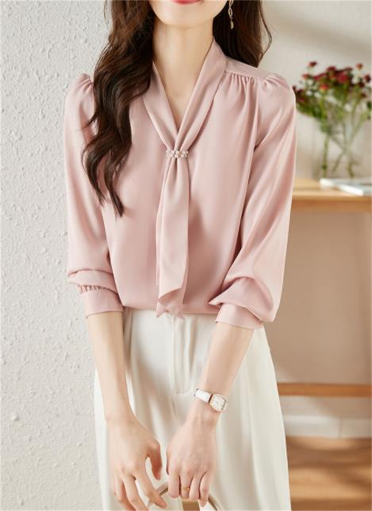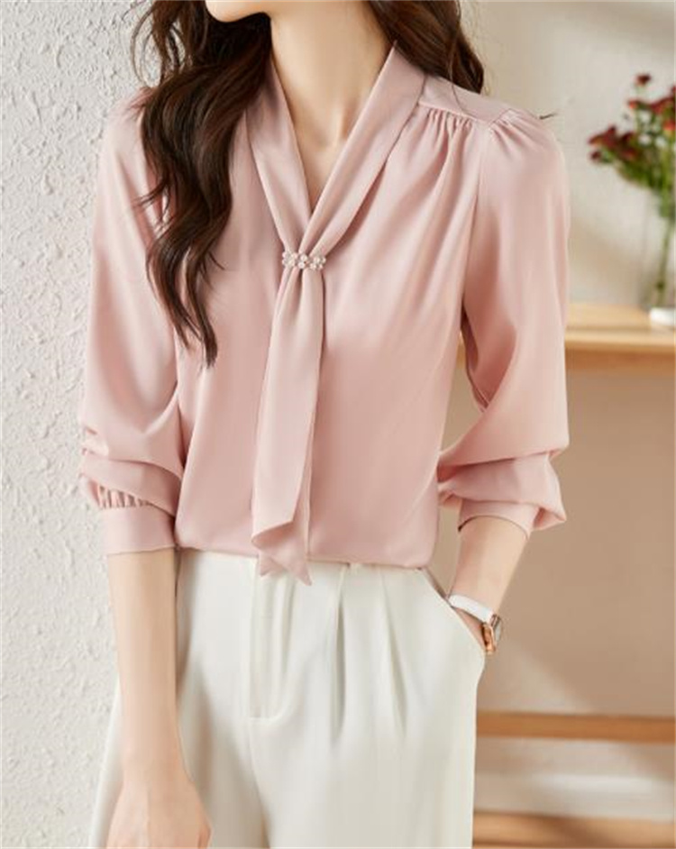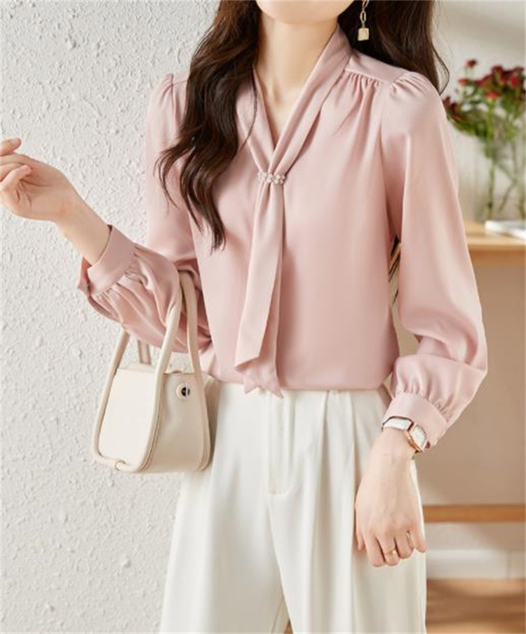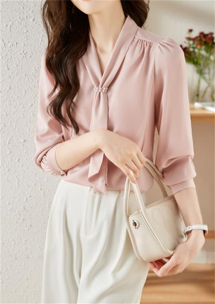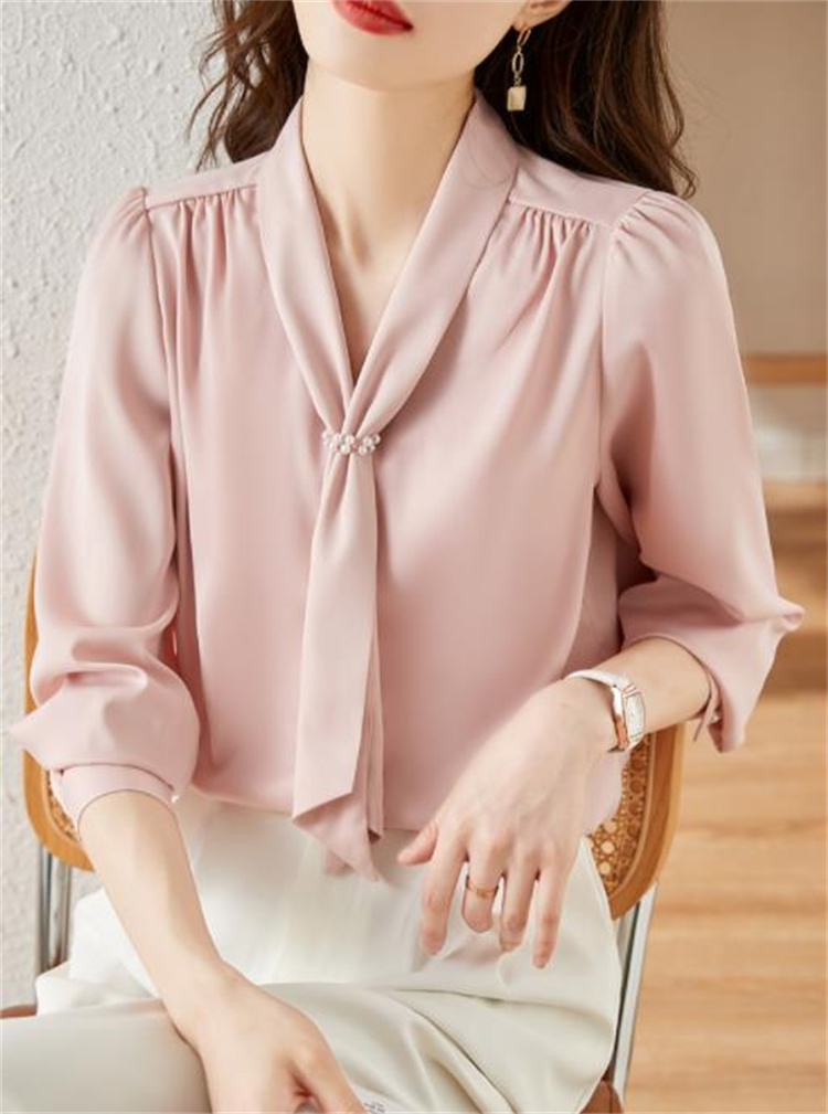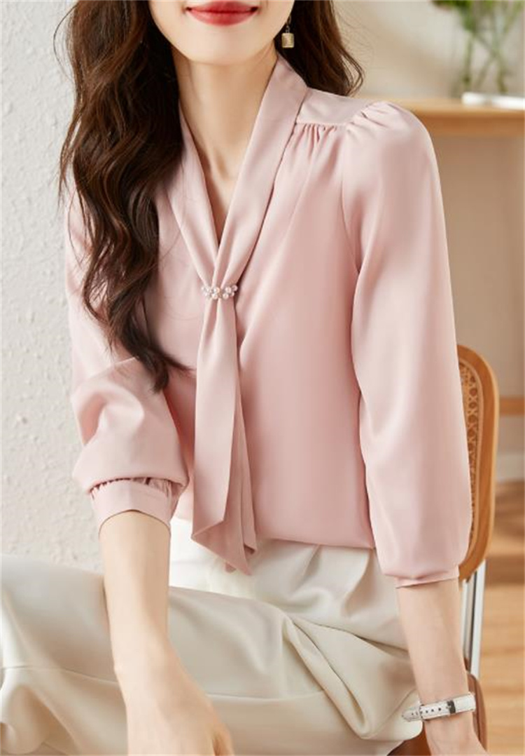 エレガントなピンクカラーが魅力的な長袖ブラウスです。