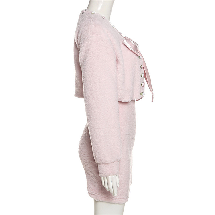 冬の新作ふわふわニット素材のワンピースとカーディガンの二点セット