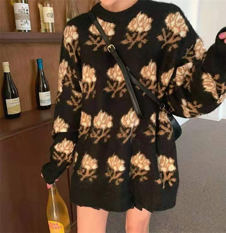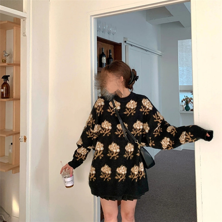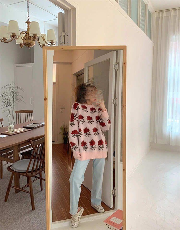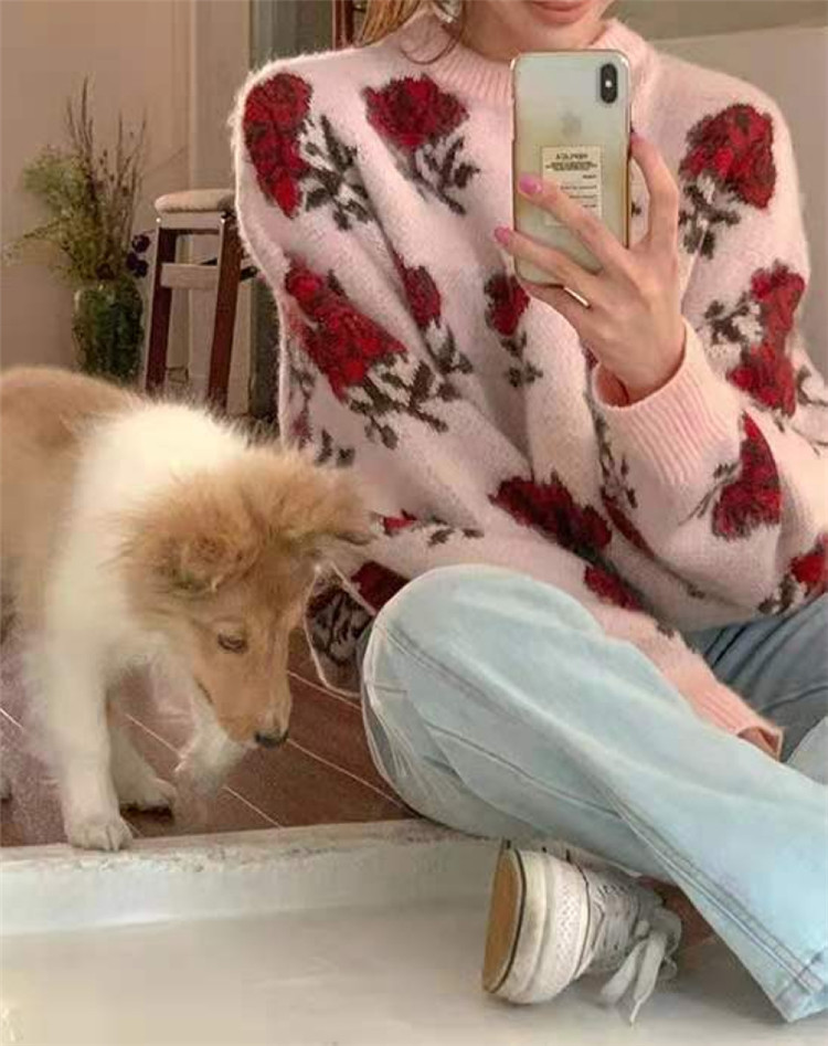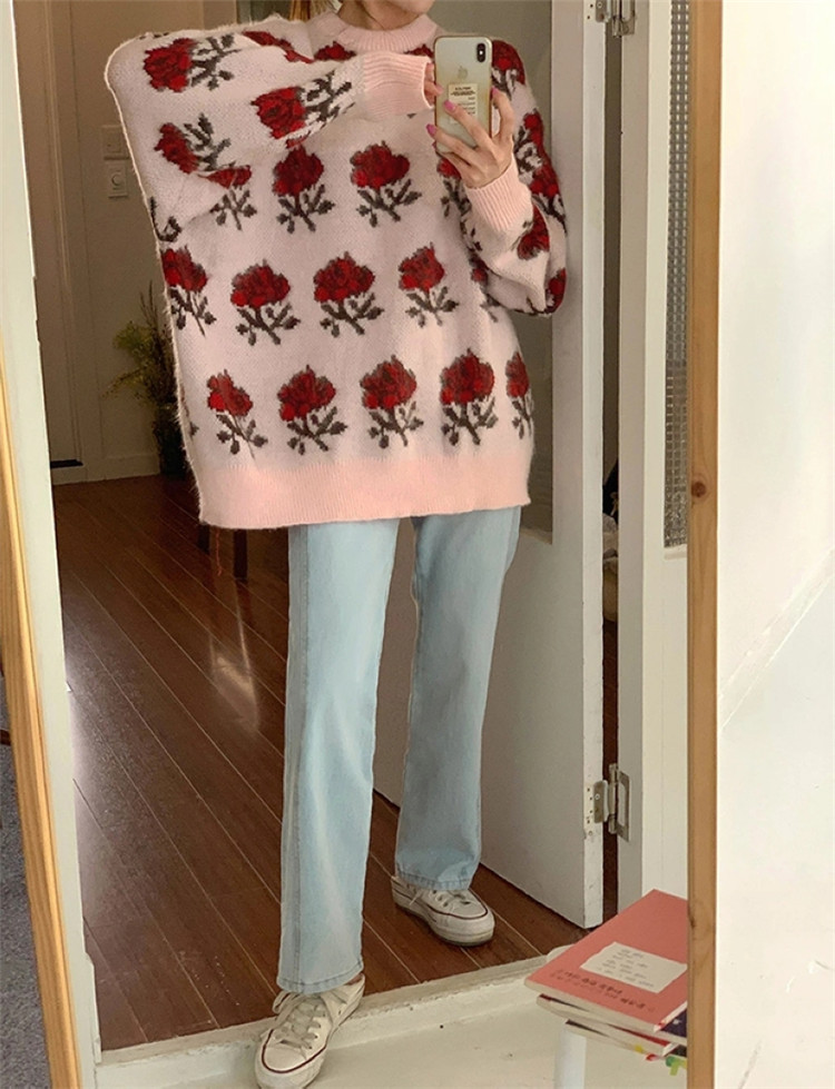 赤いバラ模様が印象的な淡いピンクのニットセーターです。 ゆったりとした着心地で体型カバーも叶えます。 ピンクコーデの主役アイテムとして、デニムとの相性も抜群。 素材:アクリル カラー:ピンク